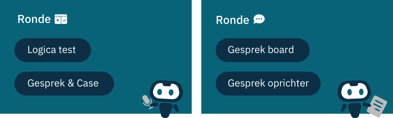 De sollicitatie bestaat uit twee ronden. De exacte inhoud en volgorde van de onderdelen stemmen we met elkaar af.